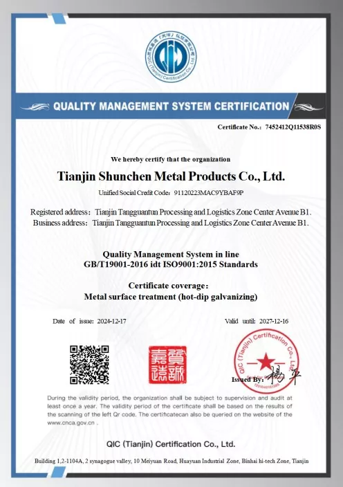 Proces galvanizace: žárové zinkování (tloušťka vrstvy zinku ≥ 85μm), elektrogalvanizace (tloušťka vrstvy zinku ≥ 12μm), v souladu s normou GB/T 13912-2020;