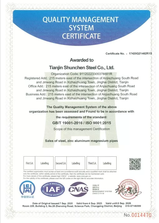 Normy: GB/T 3091-2015 "Svařované ocelové trubky pro nízkotlakou dopravu kapalin", GB/T 13912-2020 "Ocelové trubky žárově zinkované ponorem". Produkt prošel testováním třetí strany a má zkušební zprávu.