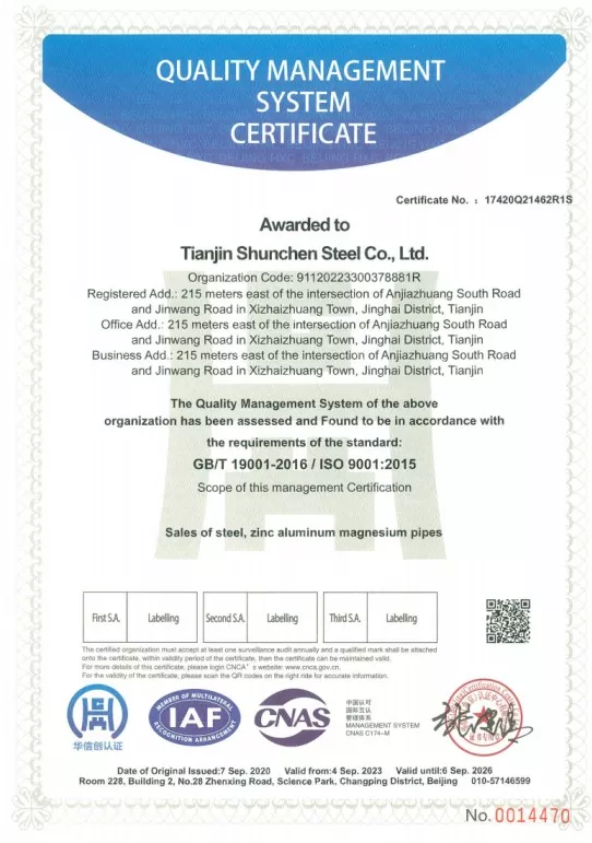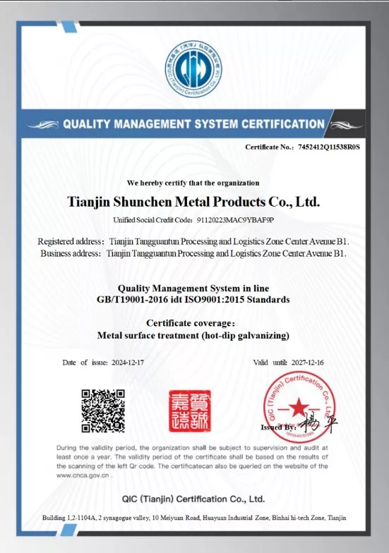 Tianjin Shunchen Industrial Company nashromáždila více než tři desetiletí výrobních zkušeností v ocelářském průmyslu. Společnost je držitelem systémových certifikací ISO 9000, 3A a také certifikace CE Evropské unie a zavedla kompletní uspořádání průmyslového řetězce od zpracování pozinkování až po prodej a distribuci. Prostřednictvím přísných 12-krokových procesních toků a třístupňového komplexního kontrolního mechanismu společnost dosáhla rekordu nulových ročních nehod v oblasti kvality a bezpečnosti a nulových selhání objednávky po dobu 12 po sobě jdoucích let. Shunchen Industrial udržuje celoroční zásoby galvanizované oceli o objemu více než 20 000 tun a tvoří tak velký supermarket z galvanizované oceli, který integruje skladování a distribuci. Sklad se rozkládá na ploše 10 000 metrů čtverečních a poskytuje solidní podporu integrovanému výrobnímu a prodejnímu servisu.