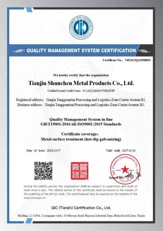 Vyberte si Shunchen pro spolehlivou kvalitu. Používáme vysoce kvalitní ocel Q235B nebo Q355B, zpracovanou žárovým zinkováním pro odolnost proti korozi. Teplota zinkového hrnce je přesně řízena v rozsahu 450-460 stupňů Celsia, aby byla zajištěna silná přilnavost zinkového povlaku a žádná vynechaná místa. Naše výrobky splňují certifikaci systému kvality ISO9001 a jsou podloženy zprávami o kontrole zinkového povlaku třetích stran.